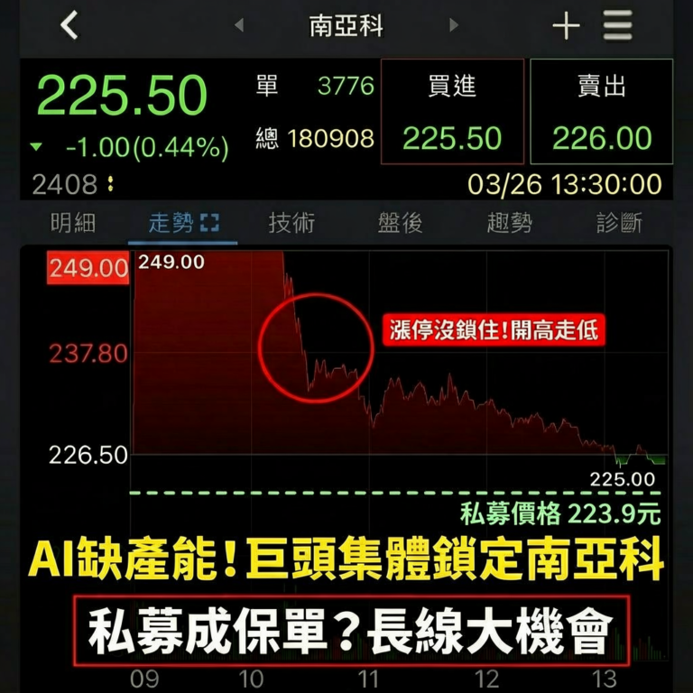 ✍🏻大盤持續區間震盪,主要看櫃買指數如果能維持月線以上,其實還是有很多個股表現的機會,來聊聊今天南亞科這走勢確實挺戲劇化的,一早開盤直接衝上249元鎖死,結果收盤拉回盤下225.5元,漲停沒鎖住。 不過回頭看,這次私募價格223.9元,今天收在225.5元,其實也就是回到成本區附近。這反而讓長線法人心裡有個底:既然Sandisk、Kioxia、SK海力士跟思科這四家巨頭都願意用這價格入股,而且還被鎖了三年不能賣,這對市場信心來說,確實是一劑超強的強心針。 很多人會問,這幾家大廠自己明明就很強,幹嘛還要大舉入股台灣一家DRAM廠? 其實這背後的邏輯挺直白的,就是為了「搶產能」,現在AI伺服器太火