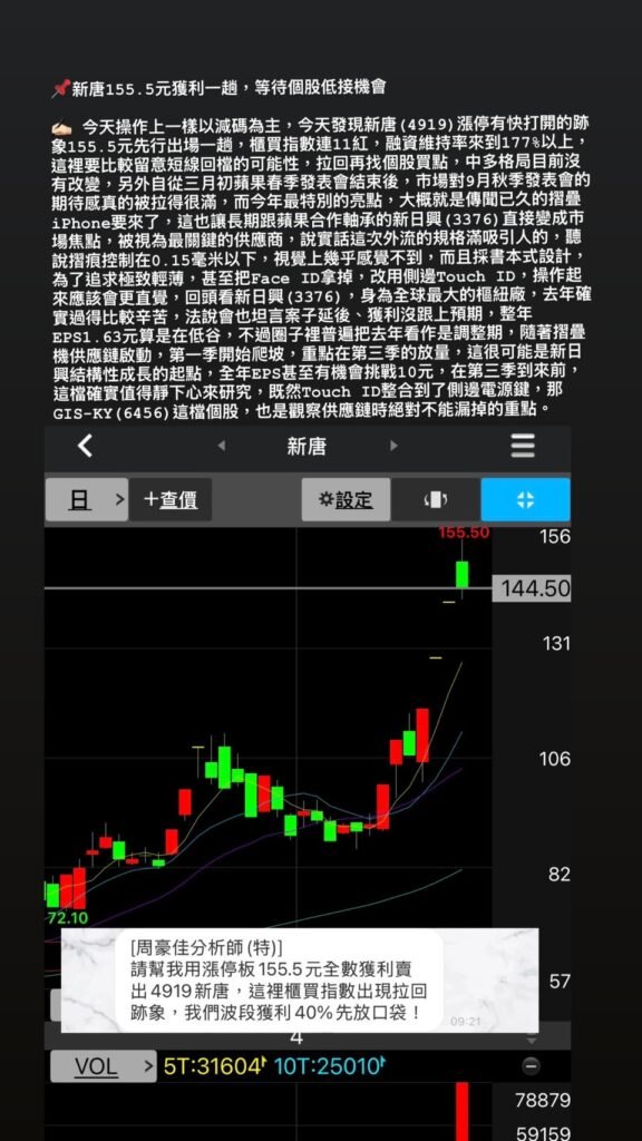 ✍🏻 今天操作上一樣以減碼為主,今天發現新唐(4919)漲停有快打開的跡象155.5元先行出場一趟,櫃買指數連11紅,融資維持率來到177%以上,這裡要比較留意短線回檔的可能性,拉回再找個股買點,中多格局目前沒有改變,另外自從三月初蘋果春季發表會結束後,市場對9月秋季發表會的期待感真的被拉得很滿,而今年最特別的亮點,大概就是傳聞已久的摺疊iPhone要來了,這也讓長期跟蘋果合作軸承的新日興(3376)直接變成市場焦點,被視為最關鍵的供應商,說實話這次外流的規格滿吸引人的,聽說摺痕控制在0.15毫米以下,視覺上幾乎感覺不到,而且採書本式設計,為了追求極致輕薄,甚至把Face ID拿掉,改用側邊Touch ID,操作起來應該會更直覺,回頭看新日興(3376),身為全球最大的樞紐廠,去年確實過得比較辛苦,法說會也坦言案子延後、獲利沒跟上預期,整年 EPS1.63元算是在低谷,不過圈子裡普遍把去年看作是調整期,隨著摺疊機供應鏈啟動,第一季開始爬坡,重點在第三季的放量,這很可能是新日興結構性成長的起點,全年EPS甚至有機會挑戰10元,在第三季到來前,這檔確實值得靜下心來研究,既然Touch ID整合到了側邊電源鍵,那GIS-KY(6456)這檔個股,也是觀察供應鏈時絕對不能漏掉的重點。