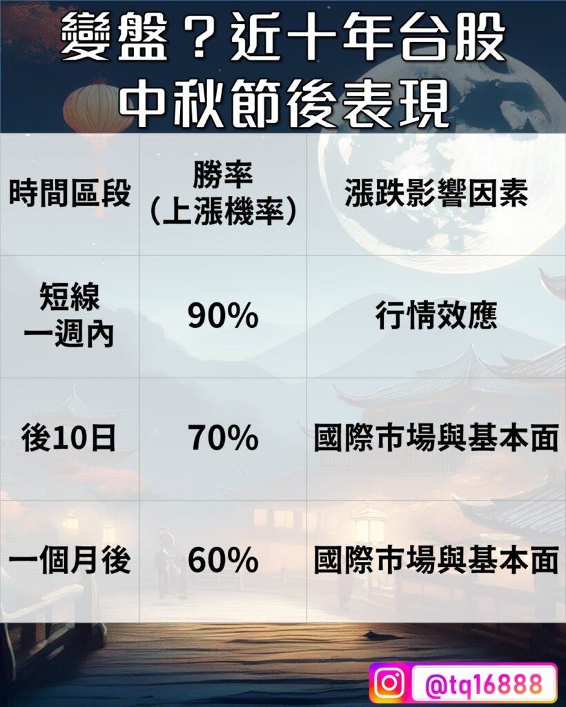 📊根據統計自2015至2024年,台灣加權指數、台灣50指數在節後五個交易日總報酬呈現90%上漲機率,特別是2024年台股在中秋節後五日與十日分別上漲2.6%與2.4%。