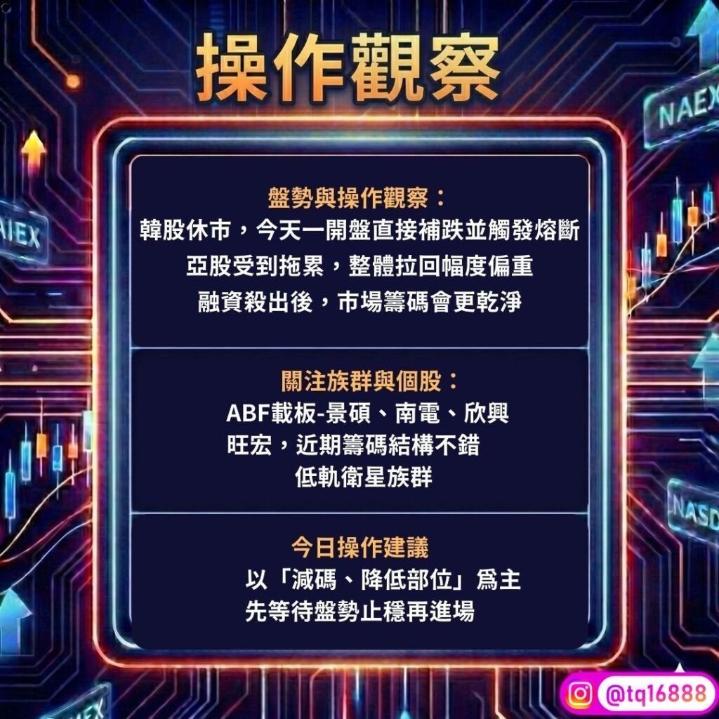 ✍🏻這兩天市場波動不小,昨天韓股休市,結果今天一開盤就直接補跌殺到熔斷,連帶亞股也被拖累、拉回幅度滿重的,不過說真的,大盤這樣殺融資對我們來說未必是壞事,個股拉回來反而可以開始找買點,像我之前持續分享的ABF載板景碩(3189)、南電(8046)、欣興(3037),還有最近籌碼不錯、帶有MLC題材的旺宏(2337),甚至是低軌衛星這些族群,在大盤殺完融資後的首波反彈通常最值得期待,至於今天的操作,建議還是先以減碼、降低部位為主,別急著硬拚,先等盤勢止穩再說。