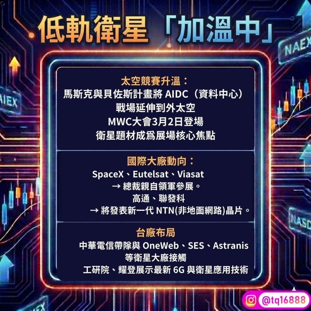 話說回來,最近產業的大戲就是即將在3月2日登場的MWC2026 了,今年除了AI依舊火熱,觀察到一個更有趣的焦點:太空競賽,現在馬斯克跟貝佐斯都計畫把AIDC資料中心的戰場拉到外太空去,這讓衛星題材成了這次展場的核心,你看像SpaceX、Eutelsat、Viasat這些大廠的總裁都親自領軍出馬,連高通跟聯發科也要發表新一代的NTN晶片,這火藥味真的很濃,台廠這次也沒缺席,中華電這次帶隊去跟OneWeb、SES、Astranis這些衛星大咖碰頭,可能是要透過之前的合作基礎,幫台灣供應鏈牽線打進歐洲體系;還有工研院跟耀登,也都在秀最新的6G跟衛星技術應用。總之,這波太空衛星競賽已經白熱化了,台廠的發揮空間大家可以多留心。